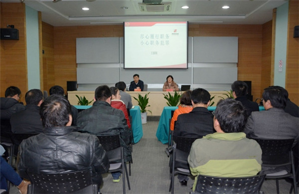 12月26日,開發(fā)公司邀請(qǐng)宿城區(qū)檢察院預(yù)防職務(wù)犯罪科科長(zhǎng)王麗娟作《盡心履行職務(wù),小心職務(wù)犯罪》專題講座,園區(qū)黨工委委員、管委會(huì)副主任、開發(fā)公司總裁陸志剛參加講座。
