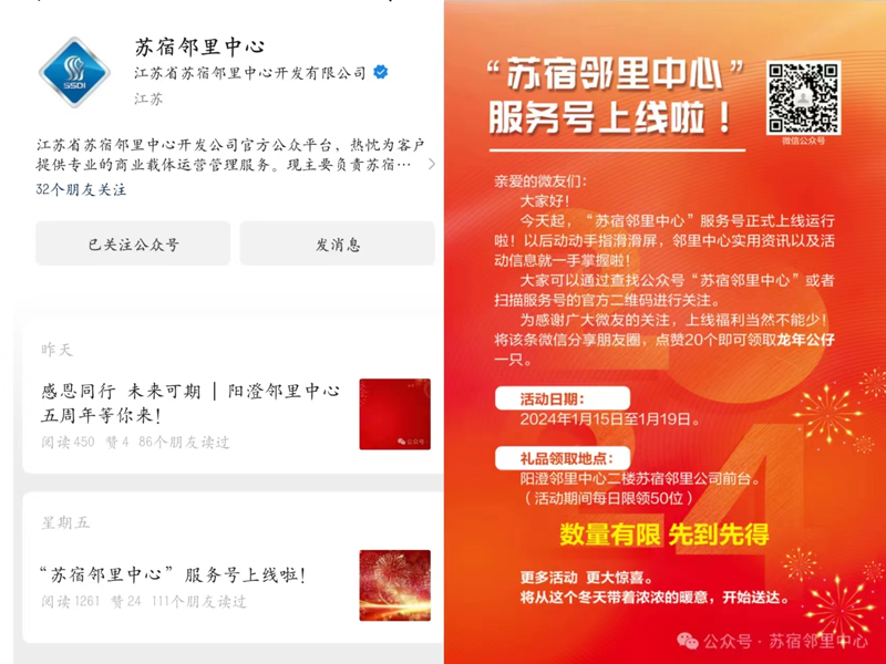 “蘇宿鄰里中心”服務號,是蘇宿鄰里公司官方賬號,旨在構建社群關系、活動宣傳、商鋪招租及有關政策等方面提供最新資訊,讓載體變得有溫度起來。