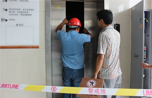 本次演練模擬在西楚金地突發(fā)的一起電梯故障困人事件而展開的應急救援。上午9時30分,兩名乘客乘坐西楚金地1號電梯升至4層時突然遭遇電梯停電,乘客緊急按動報警按鈕,語音向中控室反映電梯突然停梯,梯內被困乘客兩名。中控室接到報警后,立即啟動電梯故障困人應急救援預案,在安撫乘客的同時,迅速通知工程維修中心及維保單位。相關人員迅速兵分兩路,一路到電梯機房準備盤車,平層施救;另一路到救援樓層4層準備手動打開廳門,營救轎廂內被困乘客。從接到報警求助到救援結束,整個救援工作不到8分鐘即告成功。