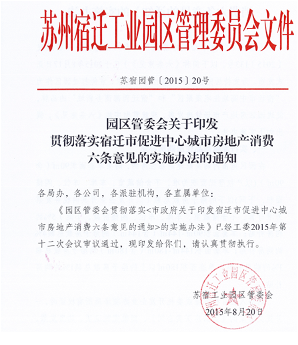 8月20日,在市政府出臺(tái)《宿遷市促進(jìn)中心城市房地產(chǎn)消費(fèi)六條意見》之后的第三天,園區(qū)率先出臺(tái)了《園區(qū)管委會(huì)貫徹落實(shí)<市政府關(guān)于印發(fā)宿遷市促進(jìn)中心城市房地產(chǎn)消費(fèi)六條意見的通知>的實(shí)施辦法》。