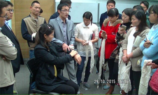 理論課上,講師們詳細生動地介紹了應急救護的基本知識,講述止血、包扎、固定和搬運等四方面內容。實訓課上,參訓者饒有興致地進行一對一實際操作,講師們現(xiàn)場進行指點。